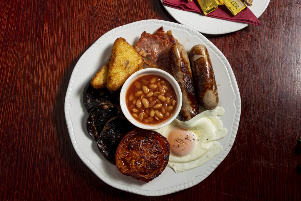 £10.95Back bacon, Cumberland sausage, baked beans, hash browns, field mushroom, black pudding and a scrambled, poached or fried egg with toast & butter.